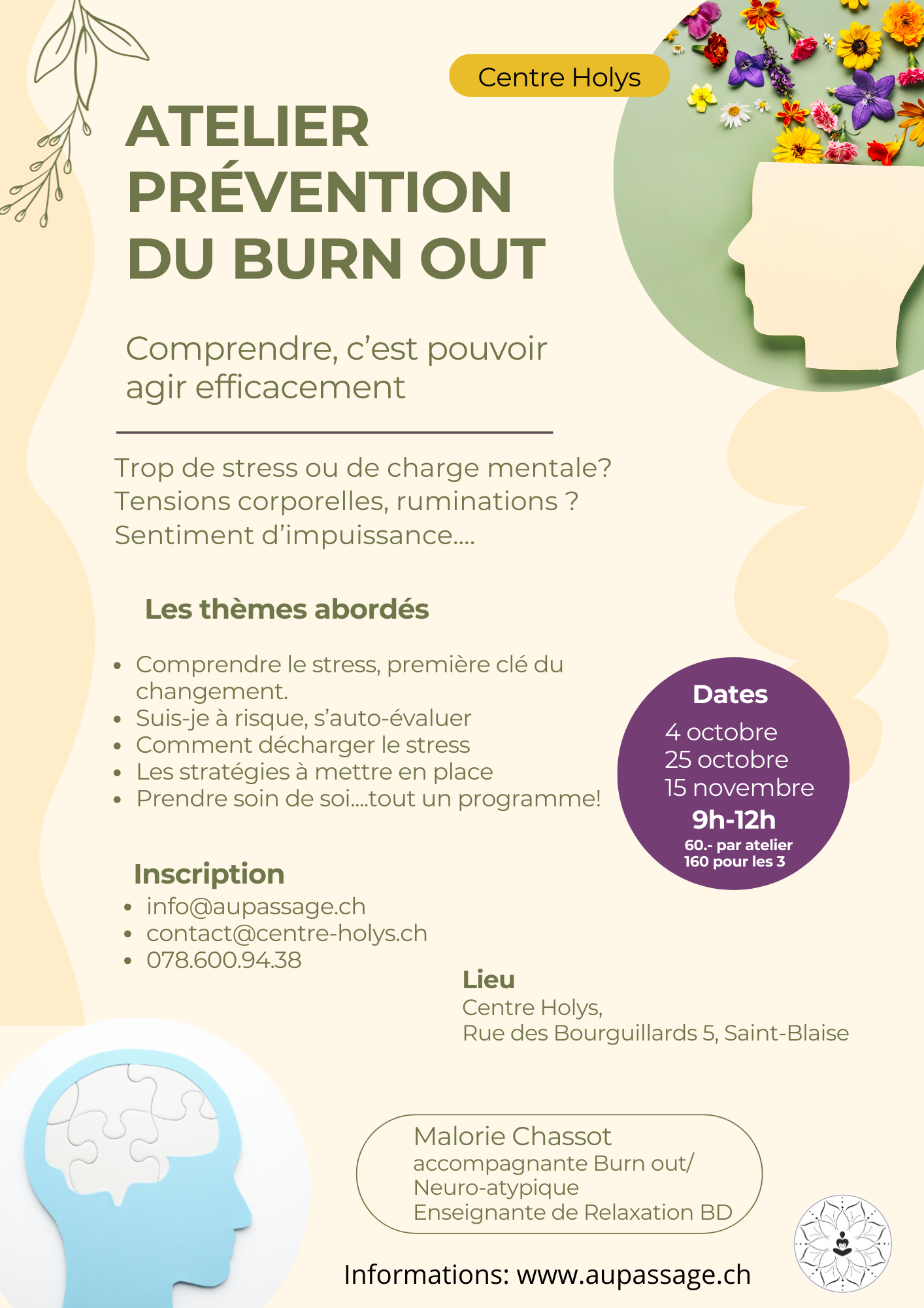 Ces ateliers peuvent se pratiquer aisément, pas besoin de connaissance, ni d’un quelconque niveau. Accessible, fluide et amenant rapidement une sensation de détente profonde tout en se sentant ancré et présent. Orienté sur la prévention de l’épuisement, ils sont indépendants les uns des autres et amènent une thématique complémentaire.